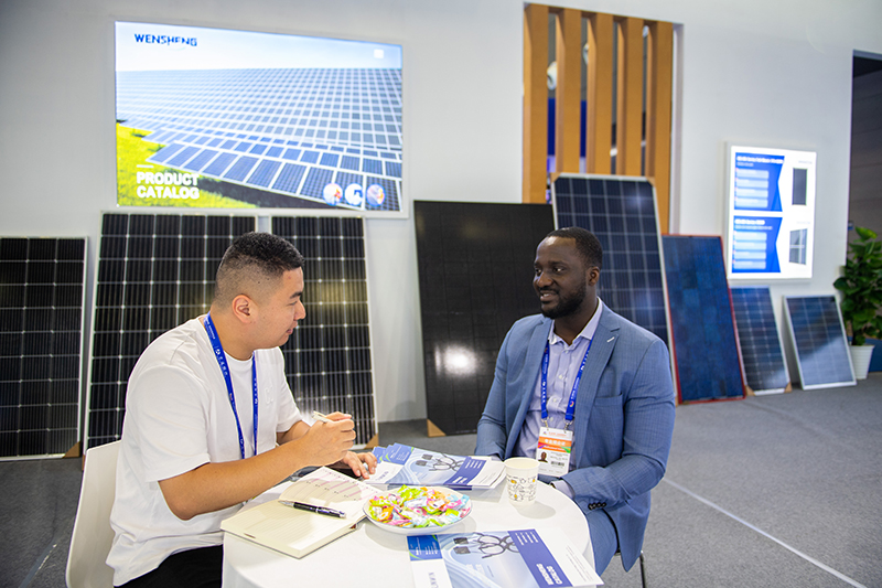 6月30日,在长沙国际会展中心,参展商(左)向观众介绍光伏发电设备。新华社记者 陈思汗 摄