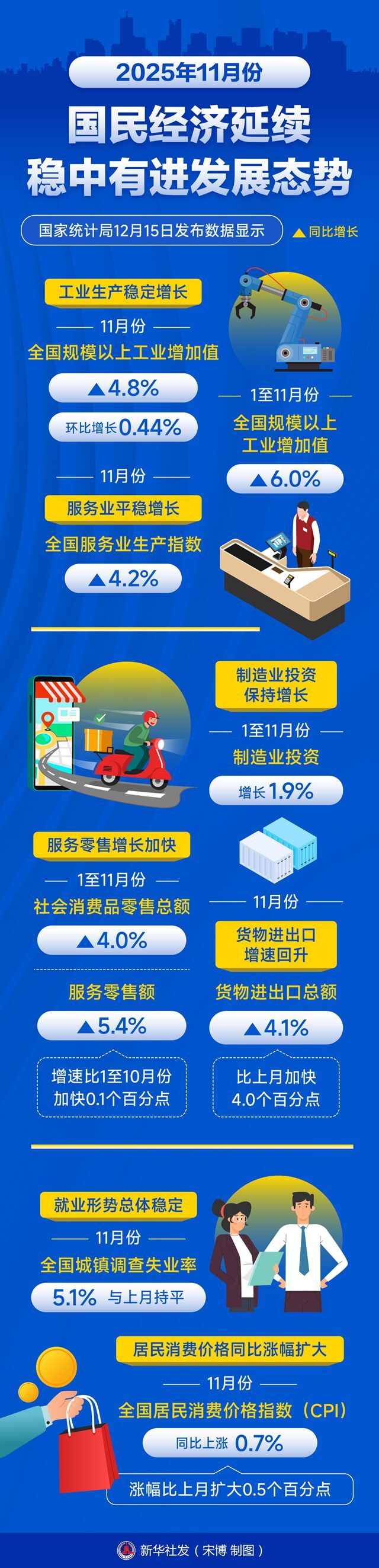 国家统计局12月15日发布数据显示,11月份,生产供给基本平稳,就业形势总体稳定,市场价格继续改善,新质生产力稳步发展,经济运行延续总体平稳、稳中有进发展态势。