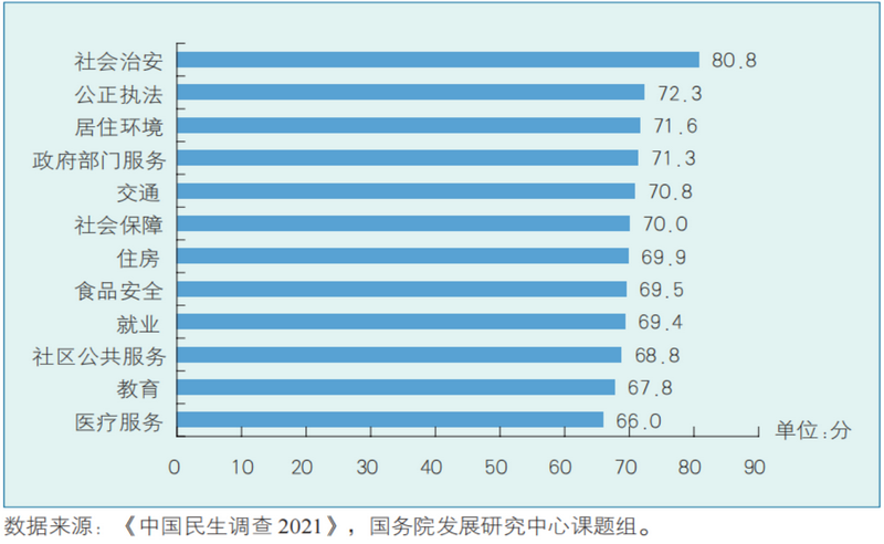 以2020年中国民生满意度电话调查为例进行说明。调查由国务院发展研究中心“中国民生调查”课题组设计并组织实施。调查围绕民生问题展开,涵盖了社会治安、公正执法、居住环境、政府部门服务、交通、社会保障、住房、食品安全、就业、社区公共服务、教育、医疗服务等12个领域。调查采用多阶段、分层抽样的方法和计算机辅助电话调查方式,在全国31个省、自治区、直辖市完成了51896个有效样本,调查对象为18—74周岁的城乡居民。如图2所示,2020年的调查充分显示了我国居民对民生各个领域的满意度。
