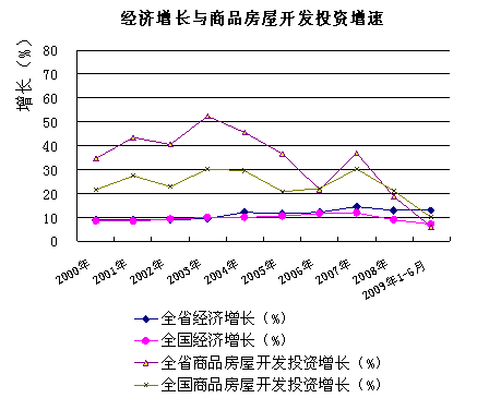 2008年,全省房地产开发企业2793个,比2000年增长3倍,企业数年均增长18.8%;完成开发投资896.41亿元,比2000年增长11倍,年均增长36.4%;占全社会投资的比重为15.9%,比2000年提高8.9个百分点,年均提高1.1个百分点。其中,商品住宅投资668.73亿元,比2000年增长15.6倍,年均增长42.1%;占房地产开发投资的比重为74.6%,比2000年提高20.9个百分点,年均提高2.6个百分点。2008年,受年初冰灾、5.12汶川大地震以及年中以来全球金融危机等影响,全省经济减速下行,房地产开发投资增速高开低走,从1-5月增长33.4%的峰值逐月快速回落,全年投资增长18.8%,比2007年大幅回落16.9个百分点。2009年上半年,房地产开发投资延续2008年快速下滑趋势,完成开发投资441.94亿元,占全社会投资的14.6%;增长6.1%,增速连续5个月下降。