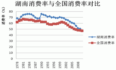 改革开放以来全省GDP年均增速达10.4%、地方财政收入名义增长12.7%,城乡居民收入却以不足7%的速度增长。 “十一五”时期全省的GDP增速达到14%,地方财政收入年均增长22.3%,城乡居民收入仍低于9%。居民收入长期低于经济增长和财政收入的增长,直接导致全省消费率偏低。2011年全省居民可支配收入在全国排第13位,在中部第1位,农村居民收入在全国排17位,中部第4位。居民收入偏低特别是农村居民收入相对落后,增速较慢是造成湖南居民支出意愿不强,消费支出下降的主要原因。