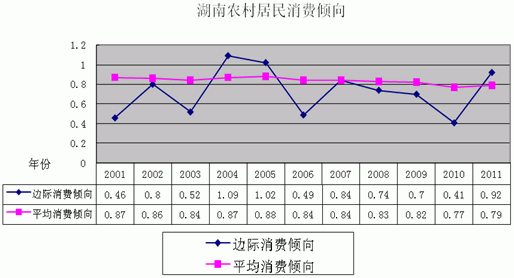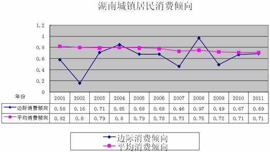 从图表中可以看到,湖南城乡居民平均消费倾向在0.7—0.9之间,但总体有下行趋势,意味着全省近年来消费支出是随着收入的增加而减少的。边际消费倾向是增加的消费和增加的收入之间的比率,也就是增加的1单位的收入中用于增加的消费部分的比率。 2001-2011年全省城镇居民最高、最低边际消费倾向相差0.69,而农村居民最高、最低边际消费倾向相差0.68。湖南城乡居民边际消费倾向波动均较大,说明居民消费伸缩性比较大,容易受到收入以外的因素的影响。