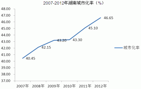 (一)新型城镇化步伐加快。近几年,随着城市经济在社会经济中的影响力逐步扩大,城市化进程明显加快。主要表现在以下三个方面:一是城市人口比重明显上升。与2007年比较,2012年全省总人口增加了 374.2万人,其中城镇人口增加了596.51万人,而乡村人口减少了222.31 万人。城镇人口占总人口比重由2007年的40.45%上升到2012年的46.65%,上升了6.2个百分点,年平均上升1.24个百分点。大量的乡村人口由农村向城镇的转移,打破了城乡分割的体制,促进了城乡经济的协调发展。二是新型城镇体系基本形成。省会长沙市市辖区常住人口由2007年的249.83万人发展到2012年的367.6万人,全省建制镇发展到 1131个,比2007年增加40个。2011年建城区面积为1408平方公里,比2007年 增加26.6%。初步形成了以省会长沙为龙头、以环长株潭城市群为主体、以中小城市为重要节点,以县城和中心镇为基础的新型城镇体系。三是城镇吸纳就业的能力不断增强。城市化和工业化的加快推进,增强了城镇吸纳就业的能力。2007-2011年,城镇从业人员从1121.34万人增加到1408.91万人,年均增加71.89万人;城镇就业人员占全省就业总量的比重从2007年的28.9%上升到2011年的35.2%。城镇就业岗位的快速增加,带动了乡村劳动力不断向城镇转移,使农村从业人员占全省从业人员的比重从2007年的71.1%下降到2011年的64.8%。
