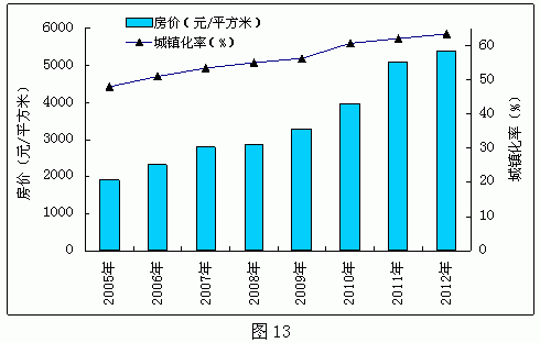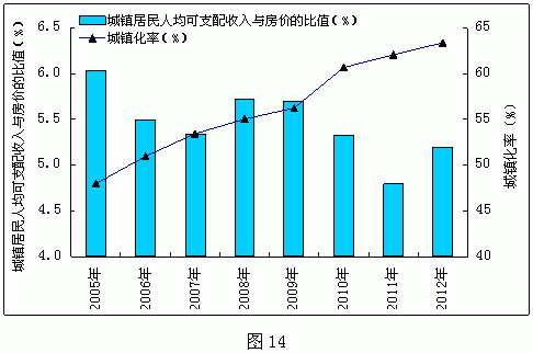 由图13和图14可以看出,2005年到2012年长株潭城市群商品房销售价格随着城镇化率逐年上升而上升。城镇化率从2005年的48%上升到2012年的63.4%,上升了15.4个百分点;商品房销售价格从2005的1900元/平方米上升到2012年的5393元/平方米,上涨了1.8倍,年均增幅16%,商品房销售价格增速高于城镇居民可支配收入的增速。2005年到2007年、2008年到2011年和2012年三个阶段,随着销售价格增长速度超过人均可支配收入的增长,长株潭城市群城镇居民人均可支配收入与商品房销售价格的比值明显下降,除了2008年国际金融危机和2012年国家加大对房地产价格调控使长株潭城市群商品房价格有略微下降或小幅增长外,长株潭城市群城镇居民人均可支配收入与商品房销售价格的比值由2005年6.0下降到2012年的5.2,这说明长株潭城市群城镇居民商品购买力水平呈下降趋势,像珠江三角洲这样的国家级城市群的状况将更加严重。房价的过快上涨,一方面使城镇化建设中同样规模的城市群实物投资需要更多的资金,大大抬高了城镇化引导的实际投资规模,另一方面又大大提高了城市群中农民变市民的门槛,甚至导致“住房城镇化”速度快于“人口城镇化”速度,难以实现真正的城镇化,使区域城镇化出现瓶颈。