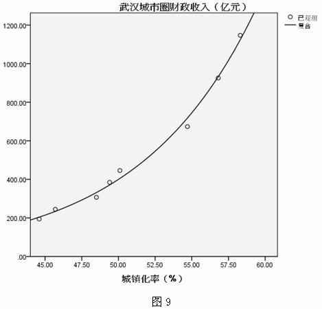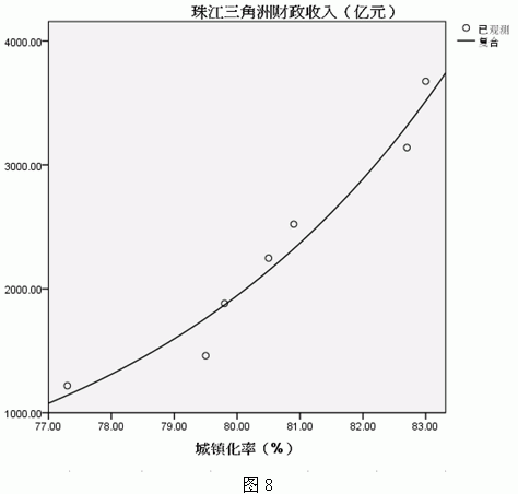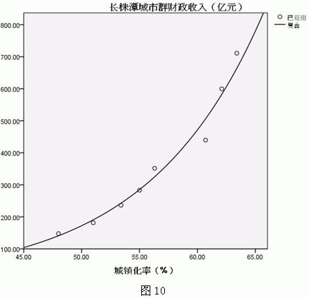 由图8、图9和图10可以看出,珠江三角洲、武汉城市圈和长株潭城市群的城镇化率与地方一般预算财政收入呈现复合增长模型,地方一般预算财政收入随着城镇化水平的提高而快速增长,各地区争相效仿城市群的城镇化模式以提高财政收入,在短短几年内就迅速出现了30多个初具规模的城市群,这说明随着城镇化不断提高,区域都向大中城市群方向发展,城市群的示范带头作用不断显现。