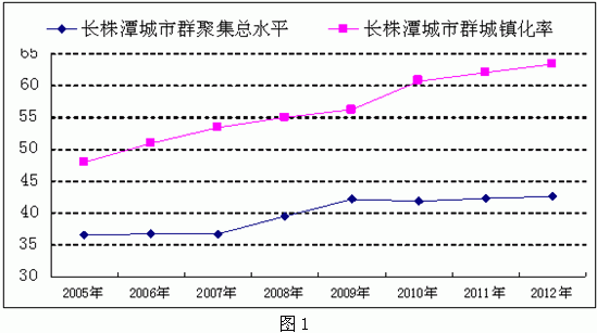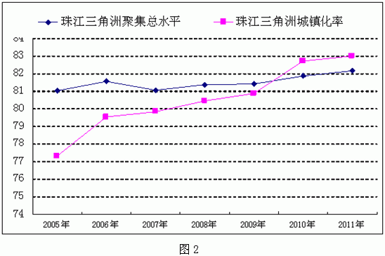 从图1和图2可以看出,珠江三角洲和长株潭城市群的聚集总水平随着城镇化率的逐年上升也逐步上升,说明随着城镇化不断提高,区域经济聚集能力也越来越强。