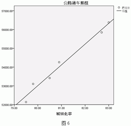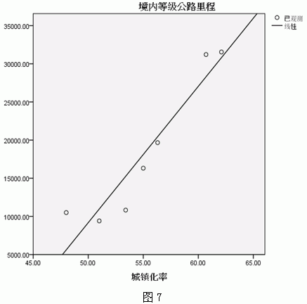 从图6和图7中可以看出,珠江三角洲显著性非常明显,R的平方为0.977,长株潭城市群显著性比较明显,R的平方为0.892,主要原因是长株潭城市群属于城镇化加速时期,对交通等基础性建设投入比较大。珠江三角洲每提高城镇化率一个百分点,公路通车里程就增加1105.487公里;长株潭城市群每提高城镇化率一个百分点,境内等级公路里程就增加1786.406公里;说明城镇化水平越高的区域,区域的公路里程会越长,交通会更加便捷,区位优势就越明显。