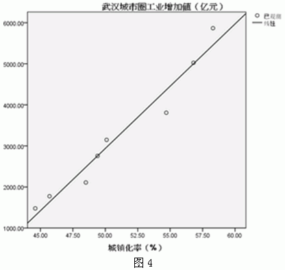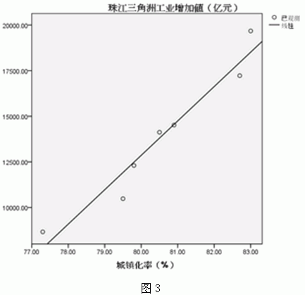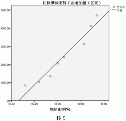 由图3、图4和图5可以看出,珠江三角洲、武汉城市圈和长株潭城市群城镇化率与规模以上工业增加值有高度线性相关,说明随着城镇化不断提高,区域中规模以上的工业增加值不断增加,工业企业的发展规模也将不断扩大。