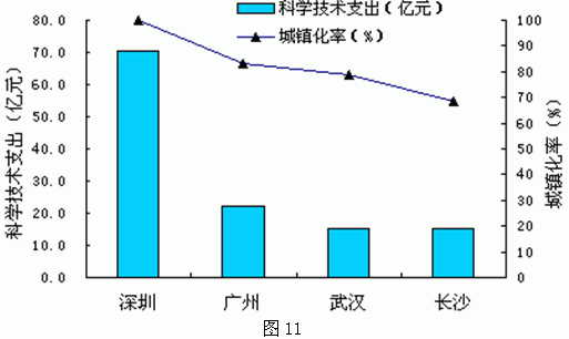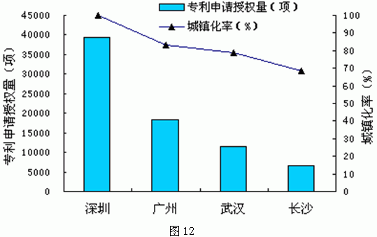 从图11和图12可以看出,深圳、广州、武汉和长沙等四大城市城镇化进程与技术创新演变趋势,珠江三角洲、武汉城市圈和长株潭城市群等区域的城镇化进程与技术创新水平变化趋势也基本一致,城镇化水平随着技术创新投入的增加而提高,城镇化水平的提高反过来又促进了技术创新产出,二者之间呈现高度的正相关。首先,从技术创新投入来看,技术创新集中于大城市,而且城市规模越大,创新投入规模也越大,城镇化对技术创新具有促进作用,技术创新往往发生在大城市,珠江三角洲中的深圳城镇化水平最高,科学技术支出也最高,长株潭城市群的长沙城镇化水平最低,创新投入也是最低的。这充分说明城镇化水平越高的区域,其资金与人员投入越大,空间聚集效应越强,则越有利于技术扩散,其技术创新能力就越强。其次,技术创新产出不仅受创新投入、城镇化水平和城市规模的影响,同时不同区域的经济发展水平、地理位置、资源禀赋差异、产业基础、市场结构、政策环境和区域开放程度也会影响区域的创新产出。深圳、广州等沿海城市开放程度较高,其创新投入、创新产出和城镇化水平也高,开放程度会影响区域的技术扩散能力,开放程度越高,区域的技术扩散能力越强。城镇化水平地区差别较大,2011年城镇化率最高的深圳市与最低的长沙市相差31.5个百分点。可见,中国区域之间城镇化水平的不均匀,一定程度上带来了区域之间创新投入与产出的差别,而创新投入与产出的差别又进一步加大了城镇化水平的地区差异。