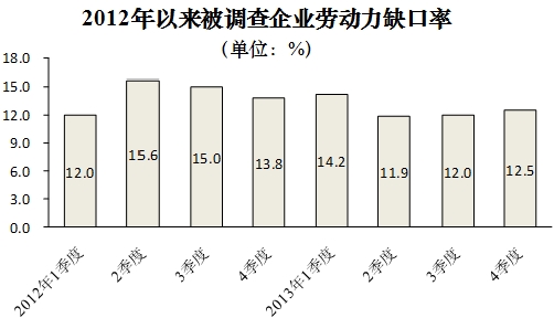被调查的企业平均产能利用率自2011年二季度达到阶段性高点79.5%后,开始持续下滑,在2013年三季度降到最低水平71.7%,四季度平均产能利用率又有所回升,达到74.0%,比上年同期调查结果低2.1个百分点,但比上季度高2.3个百分点,是2013年以来最高水平。对于影响产能正常发挥的原因,有35.5%的企业认为是“产品需求减少,订单不足”,25.9 %的企业认为是“生产能力得到充分发挥”,23.9%的企业是由于“劳动力供应不足、技能欠缺”,16.9%的企业是由于“原材料供应不足”,13.2%的企业认为是“设备检修、调试或搬迁”,12.6%的企业认为是“季节性减产”。