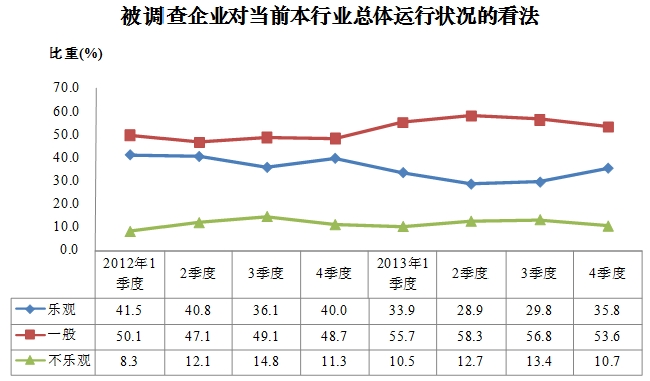 (一)八成以上企业经营状况较好,企业运行景气程度总体有所提高。从2012年一季度以来,企业对自身和当前本行业总体运行状况的景气判断基本呈持续下降态势,但在2013年四季度有回升的迹象。四季度,被调查的2222家企业中,有39.2%的企业认为综合经营状况良好,比重比上年同期调查结果低3.5个百分点,但比上季度高7.9个百分点;49.9%的企业认为综合经营状况一般,比上年同期高4.0个百分点,但比上季度低5.0个百分点;11.6%的企业认为综合经营状况不佳,比上年同期低0.5个百分点,比上季度低2.9个百分点。对当前本行业总体运行状况的看法较为乐观的企业占35.8%,比上年同期调查结果低4.2个百分点,但比上季度高6.0个百分点;表示一般的企业占53.6%,比上年同期高4.9个百分点,但比上季度低3.3个百分点;而表示不乐观的企业占比为10.7%,比上年同期低0.6个百分点,比上季度低3.7个百分点。