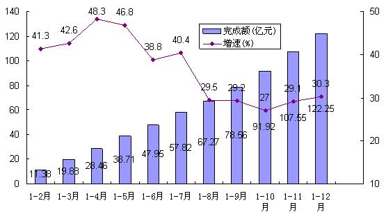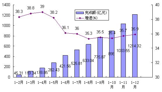 (一)总体运行平稳,顺利完成年度任务。总体来看,2013年全市固定资产投资运行呈前高后低的平稳运行态势,各月累计增速起伏不大,增速最高的月份与最低的月份相差仅3.7个百分点(见图1)。全年共完成固定资产投资1214.92亿元,同比增长35.9%,顺利完成了年度目标任务。其中,改建和技术改造投资完成668.11亿元,同比增长23.7%;房地产开发投资完成122.25亿元,同比增长30.3%。