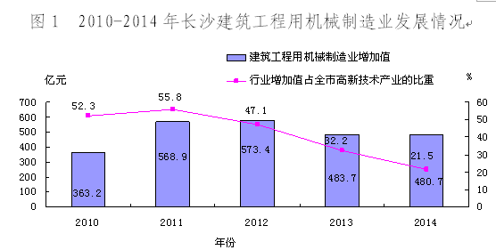 从近年来全市高新技术产业发展情况看,以三一集团和中联重科为主的建筑工程用机械制造业一直左右着全市高新技术产业发展趋势,其行业增加值占全市高新技术产业比重最高时达55.8%,可谓牵一发而动全身。而从2014年全市高新技术产业发展情况看,增加值超50亿元的行业小类共有6个,较上年增加3个,其中建筑工程用机械制造业(480.7亿元)、房屋建筑业(312.3亿元)和通信终端设备制造(155.9亿元)三行业增加值均超百亿,分别占全市高新技术产业增加值的比重为21.5%、14%和7%,其中建筑工程用机械制造业增加值占全市高新技术产业增加值的比重较上年下降10.7个百分点,与占比最高的2011年相比下降34.3个百分点。
