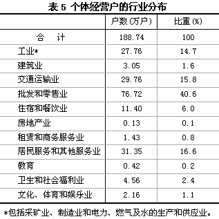 个体经营户较为集中的5个行业是:工业27.76万户,占个体经营户总数的14.7%;交通运输业29.76万户,占15.8%;批发和零售业76.72万户,占40.6%;住宿和餐饮业11.40万户,占6.0%;居民服务和其他服务业31.35万户,占16.6%(详见表5)。