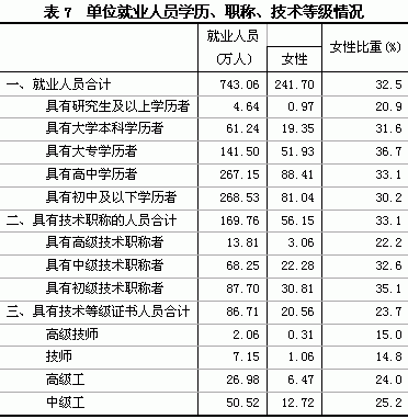 在单位就业人员中,具有研究生及以上、大学本科、专科、高中、初中及以下学历的人员分别占0.6%、8.3%、19.0%、36.0%和36.1%。在具有技术职称的人员中,具有高级、中级、初级技术职称的人员分别占8.1%、40.2%和51.7%。在具有技术等级资格证书的人员中,具有高级技师、技师、高级工、中级工资格证书的人员分别占2.4%、8.2%、31.1%和58.3%(详见表7)。