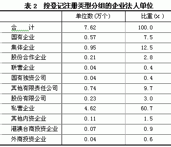 与2001年第二次全国基本单位普查的同口径数据比较,企业法人单位数减少了0.06万个,减少了0.8%。其中,国有企业、国有联营企业、国有独资公司共0.61万个,减少0.33万个,减少37.5%;集体企业、集体联营企业、股份合作企业共1.18万个,减少1.72万个,减少59.4%;其他有限责任公司、股份有限公司共0.97万个,增加0.47万个,增长94.1%;私营企业4.62万个,增加1.46万个,增长46.1%;其他内资企业0.11万个,增加0.05万个,增长69.4%,港澳台商投资企业和外商投资企业0.11万个,增加0.01万个,增长9.9%(详见表2)。