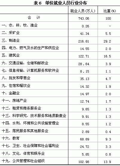 在单位就业人员中,制造业216.81万人,占29.2%;建筑业122.71万人,占16.5%;公共管理和社会组织102.98万人,占13.9%;教育68.89万人,占9.3%;批发和零售业35.13万人,占4.7%(详见表6)。