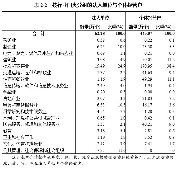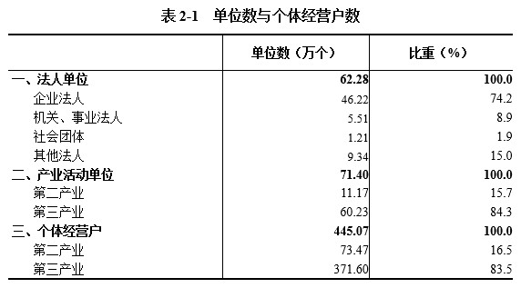 2018年末,在第二产业和第三产业法人单位中,位居前三位的行业是:批发和零售业15.49万个,占24.9%;公共管理、社会保障和社会组织7.23万个,占11.6%,租赁和商务服务业6.53万个,占10.5%。在个体经营户中,位居前三位的行业是:批发和零售业170.95万个,占38.4%;建筑业50.01万个,占11.2%;住宿和餐饮业49.29万个,占11.1%(详见表2-2)。