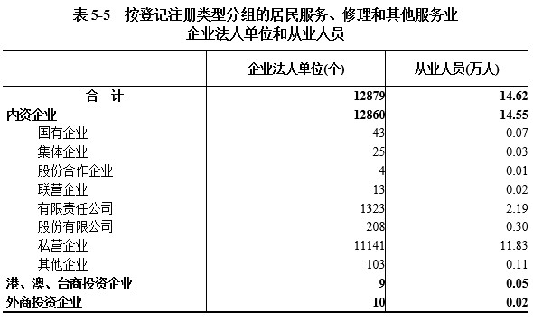 在居民服务、修理和其他服务业企业法人单位从业人员中,内资企业占99.5%,港、澳、台商投资企业占0.4%,外商投资企业占0.1%(详见表5-5)。