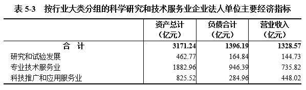 2018年末,科学研究和技术服务业企业法人单位资产总计3171.24亿元,比2013年末增长212.9%。负债合计1396.19亿元。全年实现营业收入1328.57亿元(详见表5-3)。