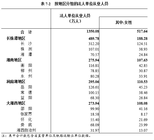 在法人单位从业人员中,位居前三位的市州是:长沙312.20万人,占23.1%;岳阳126.61万人,占9.4%;衡阳116.78万人,占8.7%。