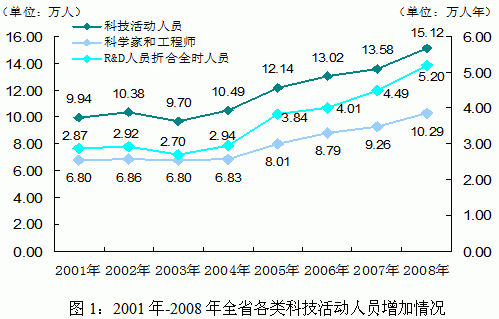 科技人才队伍不断壮大。2008年,全省从事科技活动人员达15.12万人,比上年增长11.3%,是“十五”初期的1.52倍。其中科学家和工程师10.29万人,比2001年增长51.3%。每万人口中从事科技活动人员数由上年的20.01人增加到22.16人,每万人口中科学家和工程师数由上年的13.64人提高到15.10人。从事R&D活动人员折合全时人员5.20万人年,比上年增加0.71万人年, 2001年以来年均增长8.9%。其中科学家和工程师3.96万人年,比上年增加0.38万人年,增长10.6%(见图1)。