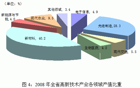 优势领域发展迅速。2008年,高新技术产业中先进制造、新材料、生物医药和电子信息四大优势领域共实现产值2739.55亿元,同比增长35.7%,占高新技术产业的77.6%;实现增加值853.78亿元,同比增长37.5%,占全省的77.7%;产值、增加值增速比产业平均水平分别高5个和6.8个百分点。此外,现代交通领域增长迅速,增加值、出口、利润同比分别增长55.6%、121.9%和85.9%。现代农业领域实现销售收入321.80亿元,增长32.4%,高出产业平均水平3.3个百分点(见图4)。
