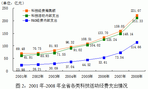 科技创新投入总量不断加大。2008年,全省各科技活动主体共筹集经费221.07亿元,比上年增长39.0%,是2001年的3.18倍。科技活动经费支出222.20亿元,比上年增长39.4%。其中,科技活动内部支出211.33亿元,占科技活动经费支出的95.1%,2001年以来年均增长19.2%。全省R&D经费内部支出为114.67亿元,比上年增长55.9%,是2001年的4.78倍(见图2)。R&D经费占GDP的比重(即R&D投入强度)为1.03%,比2001年提高0.43个百分点。全省地方财政支出中科技拨款达到26.58亿元,增长29.8%,地方财政科技拨款占地方财政支出的比重与上年持平,为1.51%。