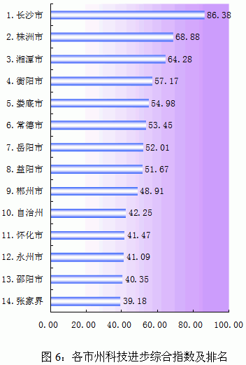 根据对各市州科技进步的监测,全省各地区总分排序依次为:长沙、株洲、湘潭、衡阳、娄底、常德、岳阳、益阳、郴州、湘西自治州、怀化、永州、邵阳和张家界(见图6)。与2007年统计监测结果比较,长沙、株洲、湘潭和衡阳的排位没有变化,是全省科技进步水平最高的地区,依然处于领先的位置;益阳和郴州科技水平稳步提高,保持了相同位次,分别为第8位和第9位;娄底、常德、自治州、邵阳各上升1个位次,分别列第5位、第6位、第10位、第13位;怀化上升2位列第11位;岳阳、永州、张家界下降2个位次,分别列第7位、第12位和第14位。