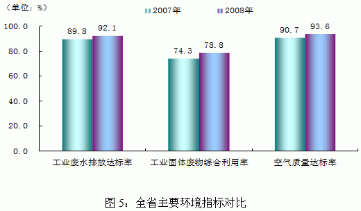 环境保护取得成效。2008年,全省各项环境保护政策执行较好,居民生产、生活环境得到较大改善。全省工业废水排放达标率为92.1%,比上年提高2.3个百分点。工业固体废物综合利用率为78.8%,比上年提高4.5个百分点。空气质量达标率为93.6%,比上年提高2.9个百分点(见图5)。空气质量达标率在90%以上的市州达到11个,比上年增加3个。