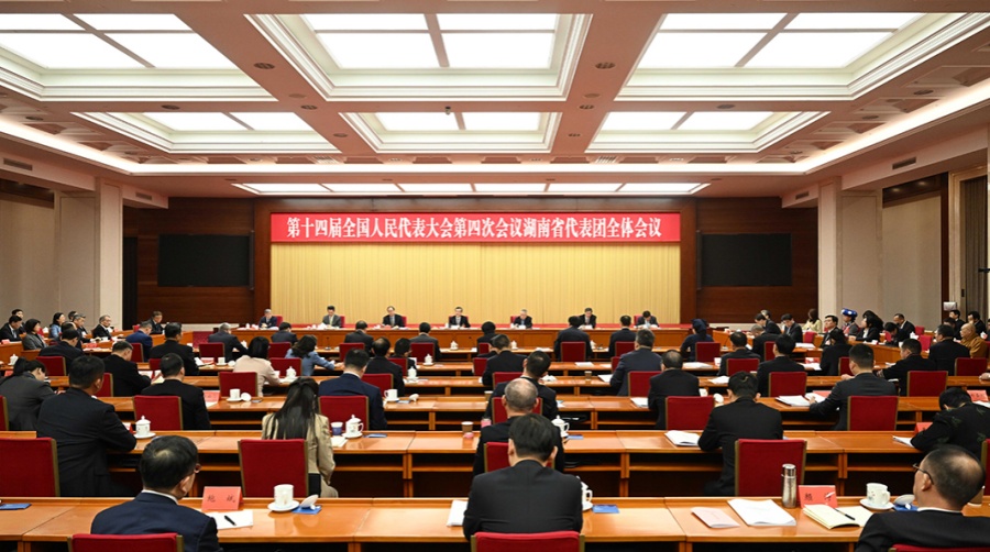 3月6日,出席十四届全国人大四次会议的湖南代表团在驻地举行第三次全体会议和分组会议,传达学习习近平总书记参加江苏代表团审议时的重要讲话精神,审议政府工作报告,审查“十五五”规划纲要草案。全国人大常委会副委员长张庆伟参加审议。