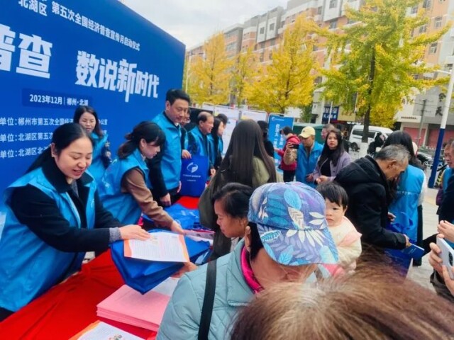 12月8日,全省多地同时举行系列宣传活动。在常德,统计部门工作人员走上街头,走进商铺、企业,宣传“五经普”即将展开的入户登记工作;在郴州,普查员代表搭展台、拉横幅、发传单,并举行宣誓仪式,吸引大量民众关注了解“五经普”。