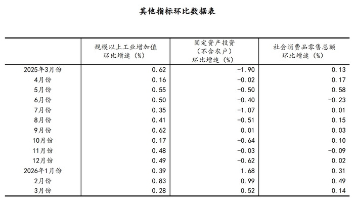 (2)根据季节调整模型自动修正结果,对近一年来各期国内生产总值、规模以上工业增加值、固定资产投资(不含农户)、社会消费品零售总额环比增速进行修订。修订结果及2026年一季度GDP环比数据、2026年3月份其他指标环比数据如下: