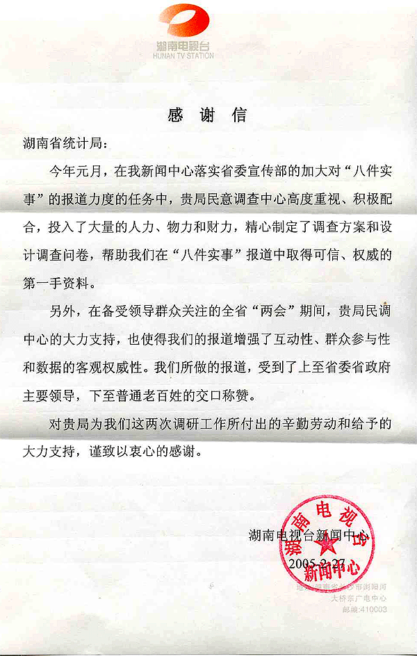 2月28日,湖南卫视新闻中心致函湖南省统计局,对民意调查中心为该台宣传“八件实事”以及两会报道提供客观、权威的民意调查数据以及为此而付出的辛勤劳动表示衷心的感谢。