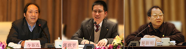 张世平(中)主持会议;李新连(左)作总结讲话;黎新明(右)主持讨论会
