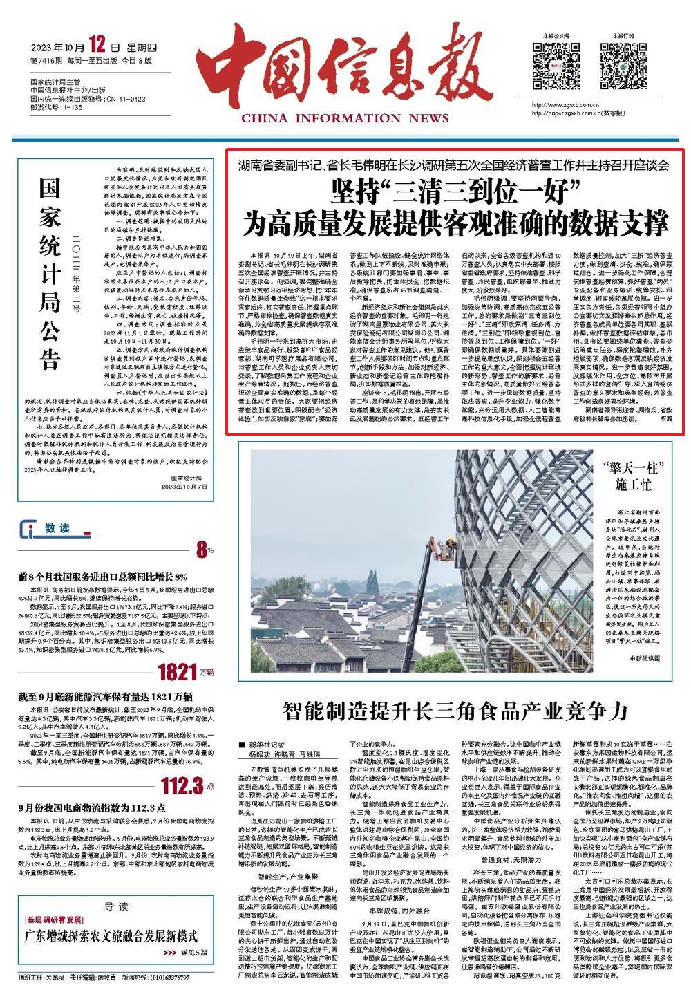 10月12日,《中国信息报》刊发通讯《湖南省委副书记、省长毛伟明在长沙调研第五次全国经济普查工作并主持召开座谈会 坚持“三清三到位一好” 为高质量发展提供客观准确的数据支撑》,全文如下: