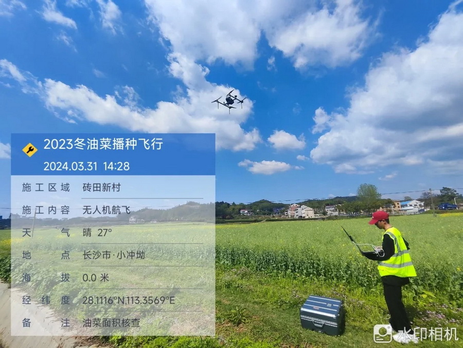 长沙市统计局与第三方公司在长沙县江背镇砖田新村利用无人机开展油菜种植面积测绘。
