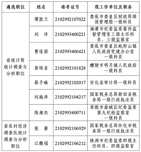 根据《湖南省公务员公开遴选实施办法》《2025年度湖南省省直机关公开遴选公务员公告》等有关规定,经笔试、业务水平测试、面试、体检、考察等程序,经省统计局党组研究,确定谭胜兰等9名同志为2025年度公开遴选公务员拟遴选对象(名单附后),试用期3个月,现按要求予以公示。