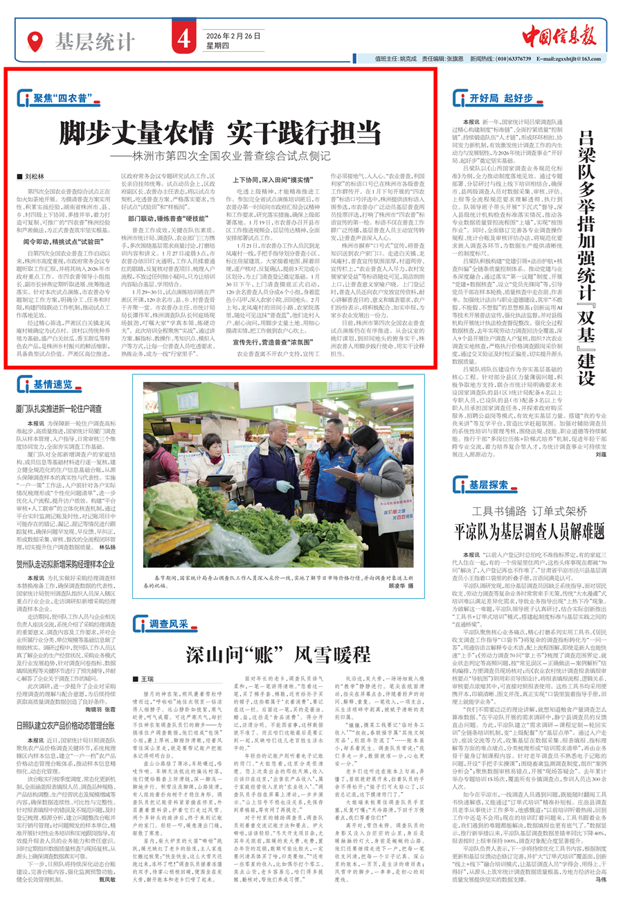 2月26日,《中国信息报》刊发通讯《脚步丈量农情 实干践行担当——株洲市第四次全国农业普查综合试点侧记》。全文如下: