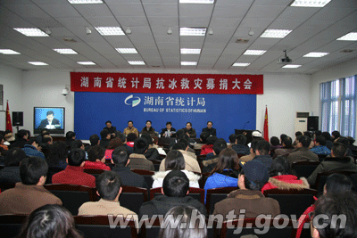 为帮助受冰冻灾害的困难群众恢复生产,重建家园,在2007年被省委、省政府授予省级文明单位和湖南省“人民满意的公务员集体”的湖南省统计局,第一时间响应省委、省政府《关于开展募捐棉衣被活动的紧急通知》精神,专门组织了这次募捐大会。大会上,省统计局局长、党组书记刘国湘向全局干部职工发出热情洋溢的倡议。他说,这次募捐是落实党的十七大精神、贯彻l落实省委省政府紧急通知的具体行动,也是发扬中华民族“一方有难,八方支援”的优良传统,顺应全局广大干部职工要求的一次有意义的活动。他深深地为全局广大干部职工的一片爱心所感动,表示一定在最短的时间内把同志们的关爱、把党和政府的关怀送到受灾群众的家中,给他们送去温暖和希望,帮助他们共渡难关。