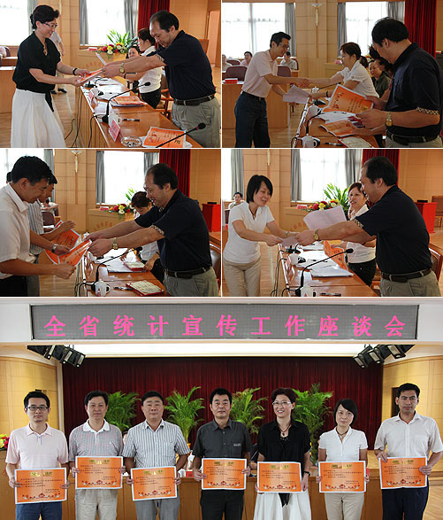 座谈会上,还表彰2008-2009年度全国统计宣传工作先进单位和个人,李新连和徐朋为获奖单位和个人颁发了奖状和证书。