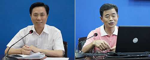 岳宗荣(左)主持讲座; 叶剑伟(右)讲授党风廉政建设专业知识