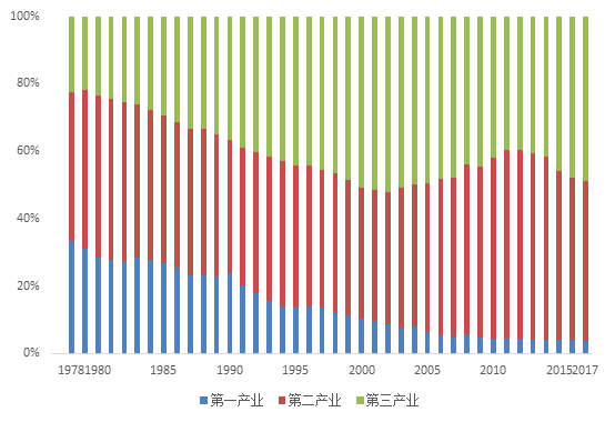 产业结构发生深刻变化。长沙三次产业增加值占GDP比重从1978年的33.3︰44.2︰22.5,到1984年的27.7:44.4:27.9,三产业比重首次超过一产业,再到2017年的3.6:47.4:49.0,以服务业为主体的现代产业结构初步确立。1978至2017年,全市一、二、三产业增加值年均实际增长分别为5.0%、14.4%和14.4%,第一产业比重下降29.7个百分点,第二产业上升3.2个百分点,第三产业上升26.5个百分点,三次产业结构实现了由“二、一、三”到“二、三、一”再到“三、二、一”的转变。