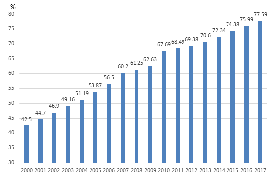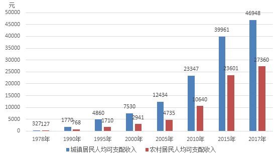人民生活极大改善。2017年,全市城镇居民人均可支配收入达46948元,比1978年翻了7.2番,年均增长13.6%;农村居民人均可支配收入达27360元,比1978年翻了7.7番,年均增长14.2%。居民收入节节攀升,消费水平大幅提升,消费层次由温饱型向全面小康型转变,2017年,全市城镇居民人均消费支出为34645元,是1980年的73倍。从改革开放初期的“缝纫机、手表、自行车”,到八十年代的“电视机、洗衣机、电冰箱”再到如今的私家小汽车满街跑,旧时王谢堂前燕,飞入寻常百姓家。2017年,全市城镇居民家庭平均每百户移动电话251部、家用电脑91.4台、家用汽车55.1辆,人均住宅面积45.5平方米;农村家庭平均每百户移动电话305.5部、家用电脑41.0台、空调器162台,人均住房面积59.1平方米。