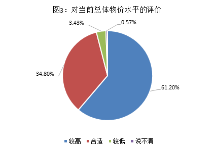 对于当前总体物价水平,61.20%的消费者认为“较高”,34.80%认为“合适”,3.43%认为“较低”。其中,城镇消费者认为“较高”的比例高出农村5.1个百分点。(见图3)