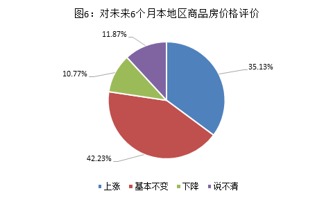 对于未来6个月本地区商品房价格,35.13%的消费者预期“上涨”,42.23%预期“基本不变”,10.77%预期“下降”。其中,城镇消费者预期“上涨”的比例高出农村3.6个百分点。(见图6)