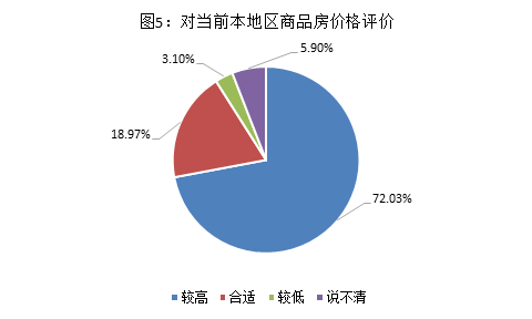 对于当前本地区商品房价格,72.03%的消费者认为“较高”,18.97%认为“合适”,3.10%认为“较低”。其中,城镇消费者认为“较高”的比例高出农村5.4个百分点。(见图5)