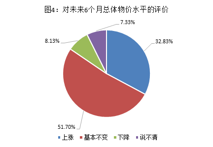 对于未来6个月总体物价水平,预期“上涨”、“基本不变”和“下降”的占比分别为32.83%、51.70%和8.13%。其中,城镇消费者预期物价“上涨”的比例高出农村3.4个百分点。(见图4)