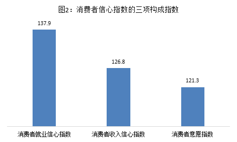 从消费者信心指数的三项构成指数来看,就业信心指数相对较高,为137.9,收入信心指数和消费意愿指数分别为126.8和121.3。(见图2)