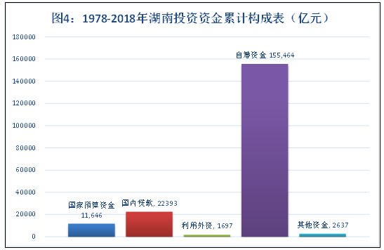 从自筹资金来看,为了发挥地方政府和项目单位投资积极性,进行了大规模的放权让利改革,全省投资资金来源中项目单位自筹资金的比重迅速上升。1978-2018年,全省项目单位自筹资金累计15.55万亿元,占全部资金来源的70.6%,年均增长21.8%。其中,2018年全省项目单位自筹资金0.99万亿元,占全部资金来源的60.6%,比1978年提高12.5个百分点。